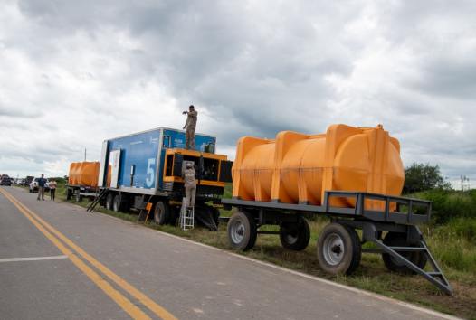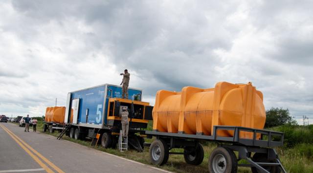 En el marco del operativo de emergencia, instalan una planta potabilizadora móvil para garantizar el abastecimiento de agua a la población, complementando el trabajo que lleva adelante la SAT para restablecer el servicio en la localidad.