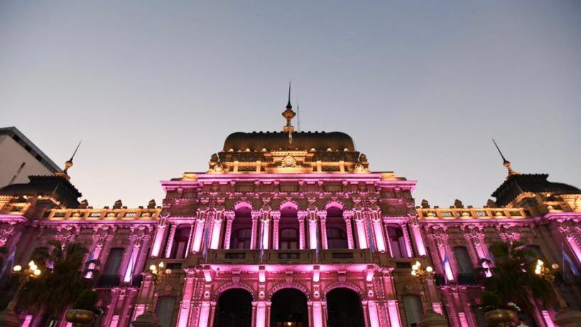 En el marco del Mes Rosa, la Casa de Gobierno se iluminó esta noche de color rosa como símbolo de concientización y prevención contra el cáncer de mama.