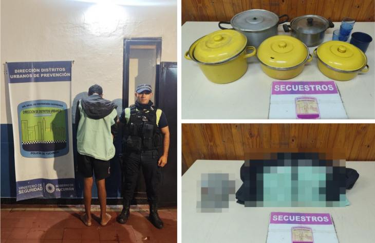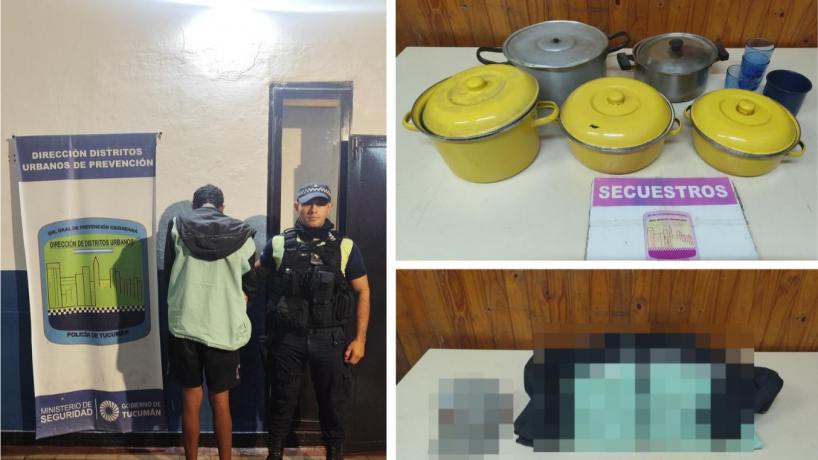 En circunstancias que los uniformados realizaban recorridos de prevención advirtieron el intento de fuga de un ladrón que había ingresado a robar en una vivienda de calle Moreno al 700. El susodicho fue capturado y reducido por los agentes cuando saltaba por la tapia del inmueble llevándose un juego de ollas y demás artículos de cocina que había sustraído del lugar.
