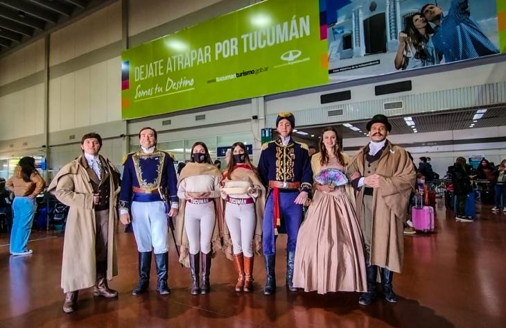 En primer lugar, quienes esperaban para embarcar hacia nuestra provincia en las instalaciones del Aeroparque Jorge Newbery, fueron sorprendidos con una intervención de músicos y parejas de danzas folclóricas que llevaron ritmo a los turistas, que también pudieron degustar las delicias típicas del Norte. Al mismo tiempo, en el área de desembarque del Aeropuerto Internacional Teniente Benjamín Matienzo, personajes vestidos de época junto a promotoras del ETT esperaron a los pasajeros que arribaron desde Buenos Aires con escarapelas y dulces regionales.