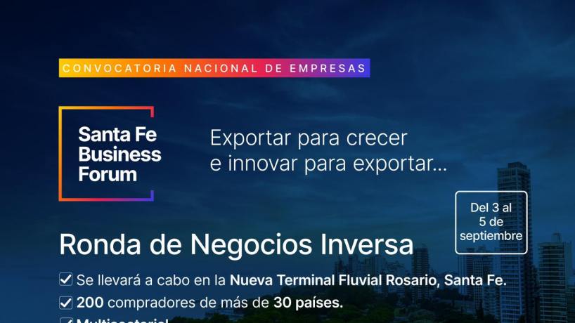 El IDEP Tucumán (Instituto de Desarrollo Productivo) hace extensiva la convocatoria de la agencia Santa Fe Global, que organiza el encuentro Santa Fe Business Forum, una expo para empresas exportadoras. En el marco de esta actividad se desarrollará una Ronda Inversa de Negocios, prevista del 3 al 5 de septiembre, en la Nueva Terminal Fluvial de Rosario.