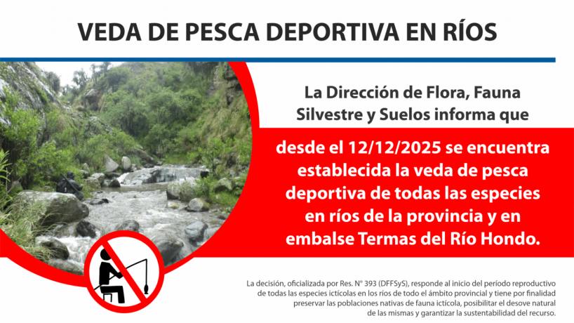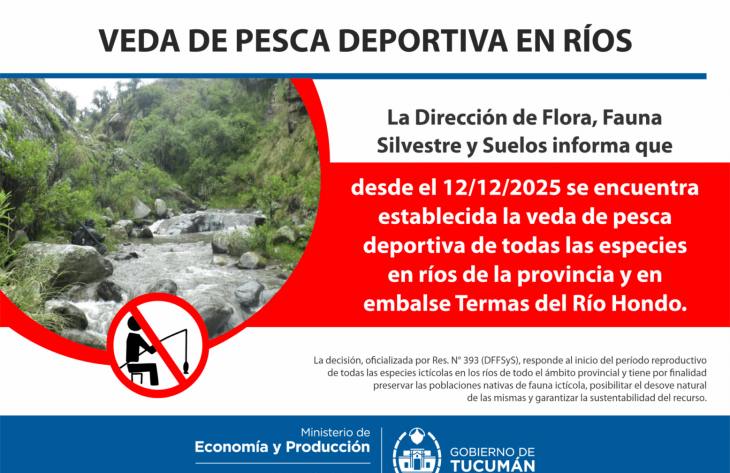 La Dirección de Flora, Fauna Silvestre y Suelos (DFFSyS), dependiente de la Secretaría de Producción, informó que desde el 12 de diciembre del corriente año quedó establecida la veda de pesca deportiva sobre todas las especies de fauna ictícola en ríos o cursos de agua temporarios y permanentes del ámbito provincial, incluido el sector tucumano del embalse Termas del Río Hondo.