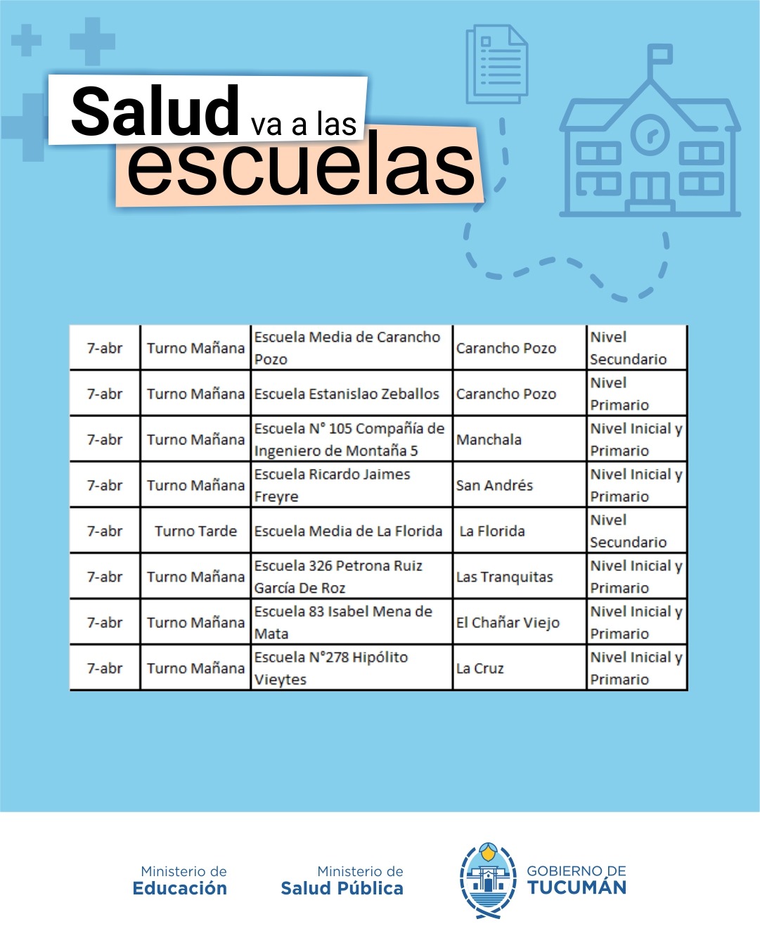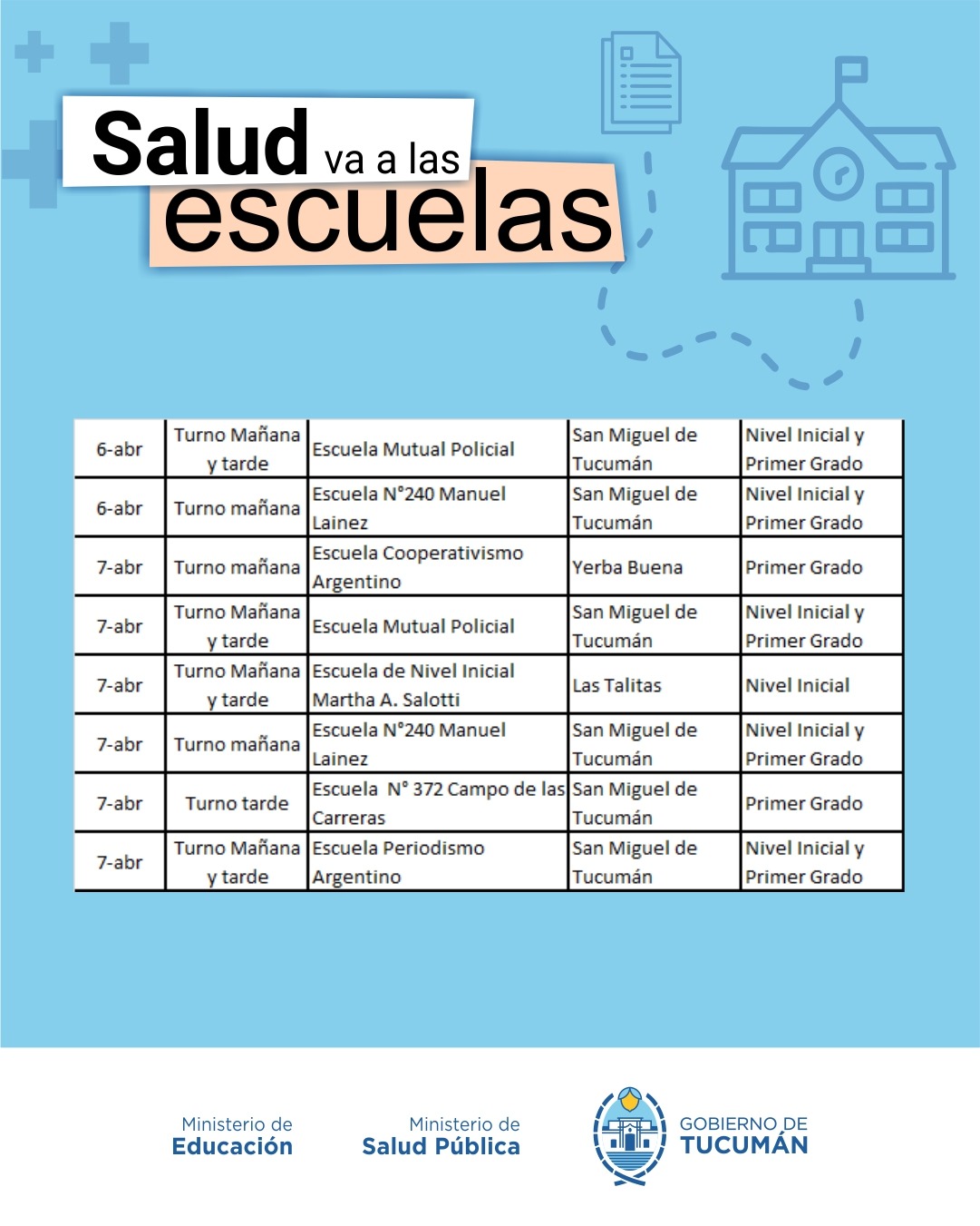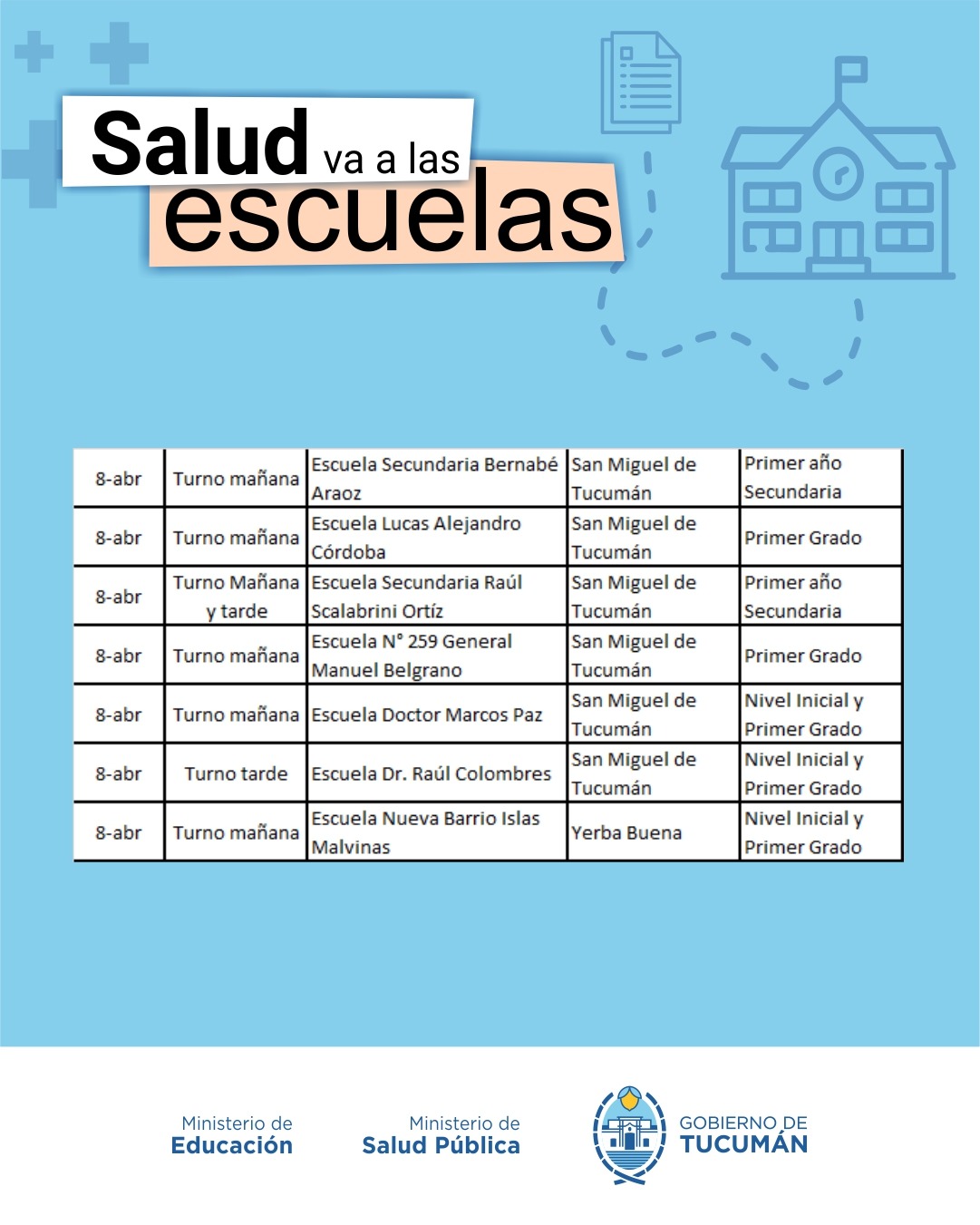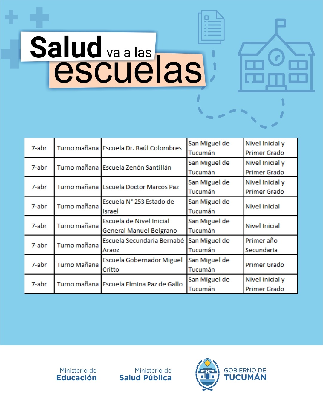 El operativo es organizado de manera conjunta entre el Ministerio de Salud y el Ministerio de Educación, y recorrerá todas las escuelas públicas tanto de la Capital como del Interior de la provincia.