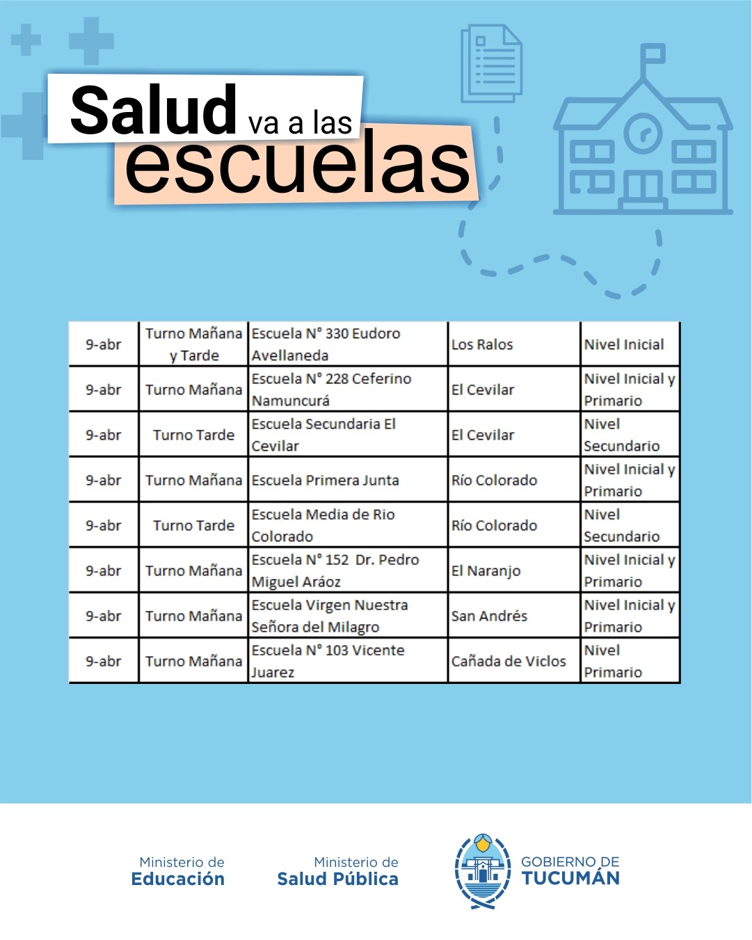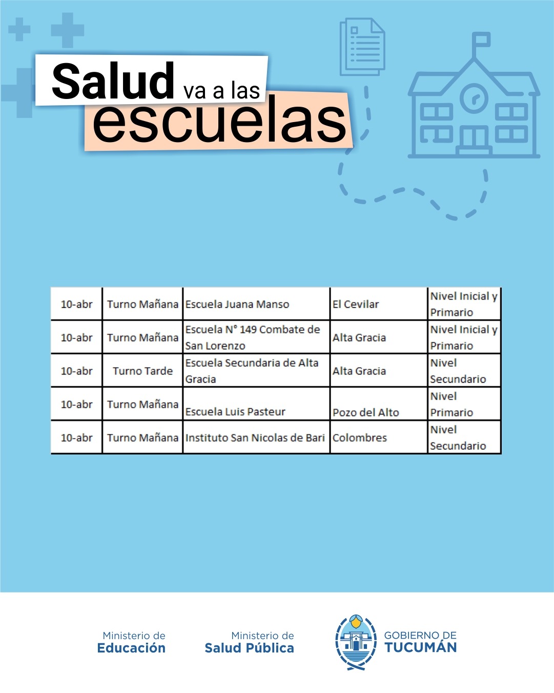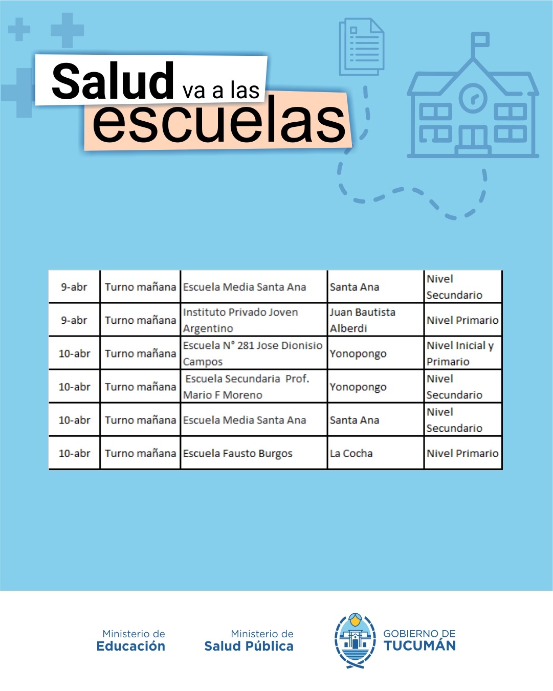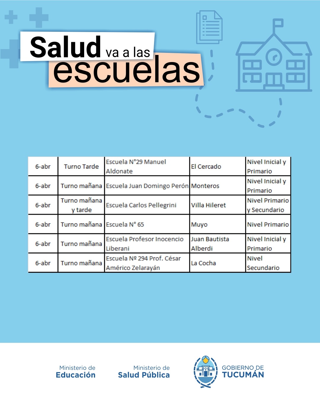 El programa volvió a desarrollarse en todo el territorio provincial, en el marco del inicio ciclo lectivo 2026. El mismo fue delineado en conjunto por el ministro de Salud, doctor Luis Medina Ruiz, y la ministra de Educación, profesora Susana Montaldo, en consonancia con los lineamientos establecidos por el gobernador de la provincia, contador Osvaldo Jaldo.