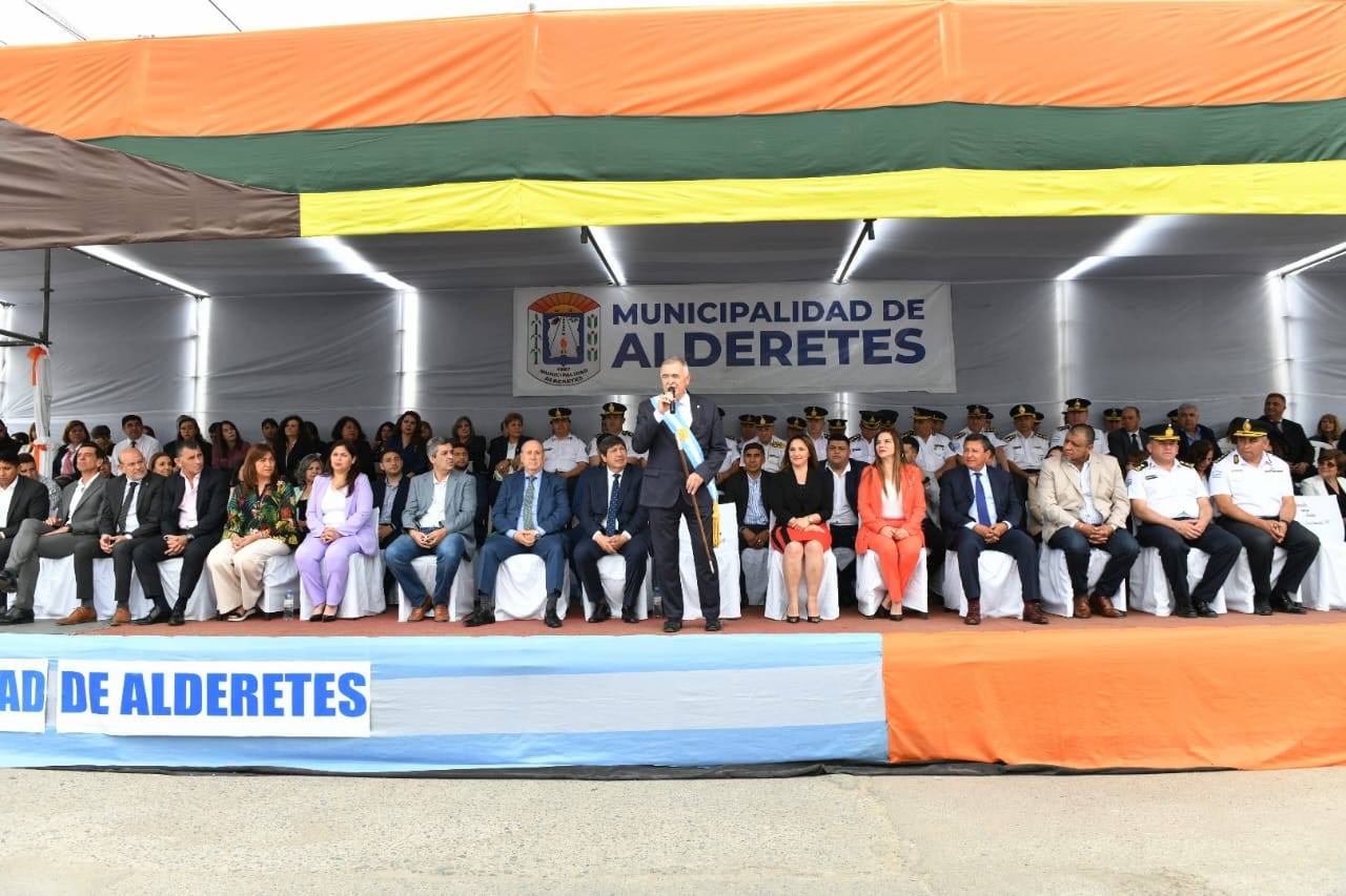 En su discurso, Jaldo recordó que Alderetes fue creada como municipalidad el 24 de septiembre. "Este día rinde homenaje a la Virgen de la Merced, patrona del Ejército Argentino, y también a un momento clave de nuestra historia: la batalla de Tucumán, un evento que cambió el rumbo de nuestra nación".