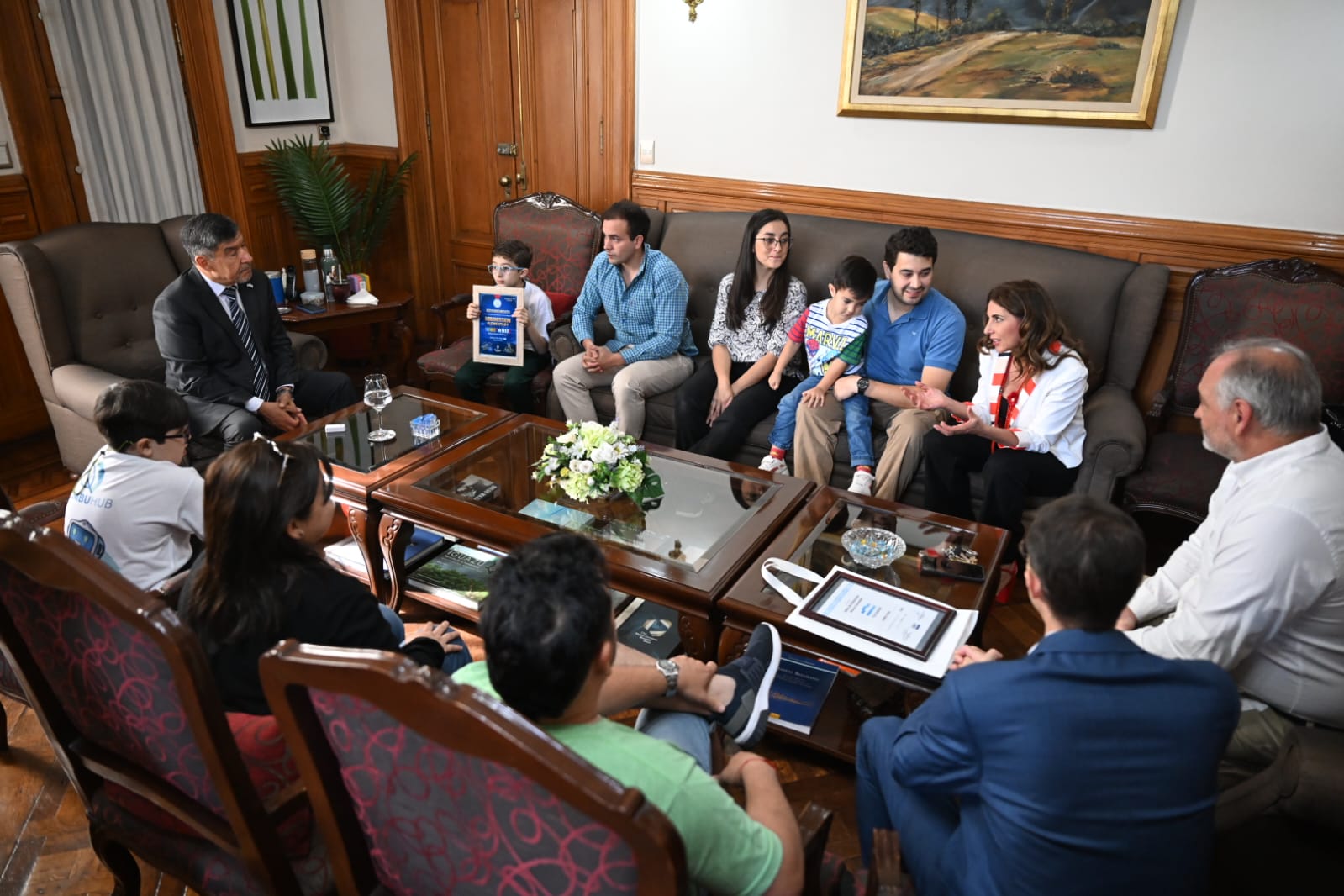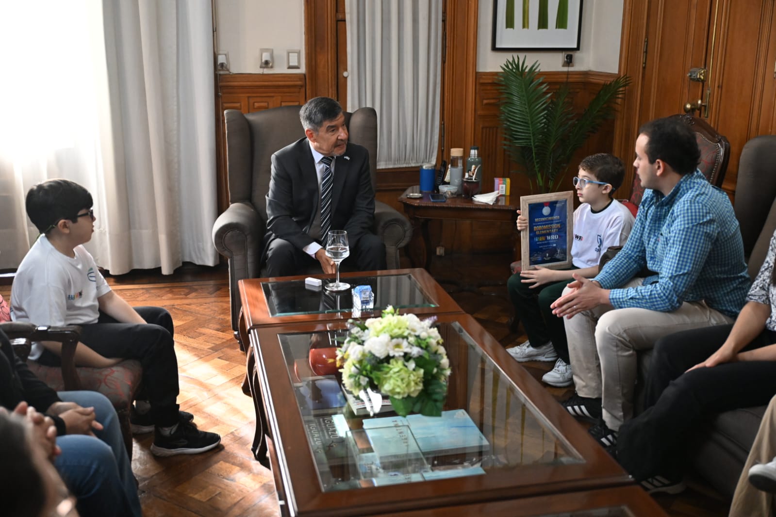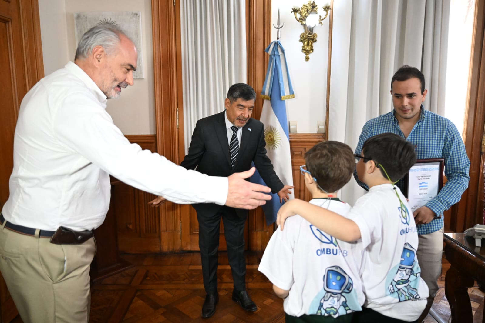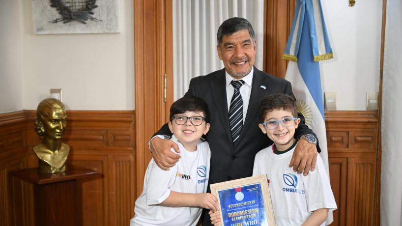 El vicegobernador a cargo del Poder Ejecutivo, Miguel Acevedo, recibió en Casa de Gobierno a los niños tucumanos Benicio Diez González y Luca Di Pauli, ganadores del segundo puesto en la competencia nacional de la World Robotic Olympics realizada en el marco de la Exposición de Economías del Conocimiento (ExpoCon) 2025. Los alumnos, pertenecientes a la Academia Digital Ombú Hub de Yerba Buena, asistieron acompañados por el director de la institución, Nicolás Caro.