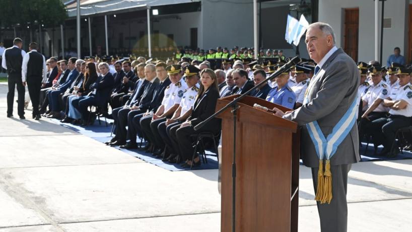 El mandatario mencionó avances en materia de seguridad. Indicó: “esta es la policía que en dos años bajó los homicidios un 50%; esta es la policía que bajó los delitos un 30%; esta es la policía reconocida a nivel nacional por la actual ministra de Seguridad de la Nación, Patricia Bullrich”. Señaló también que la fuerza fue destacada por su aporte a la reducción de índices delictivos a nivel federal.