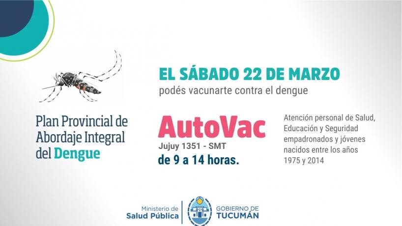 El Ministerio de Salud Pública, a cargo del doctor Luis Medina Ruiz, informa que, en el marco del Plan Provincial de Abordaje Integral del Dengue, este sábado 22 de marzo, se llevará a cabo un importante operativo de vacunación en Avenida Jujuy 1351.