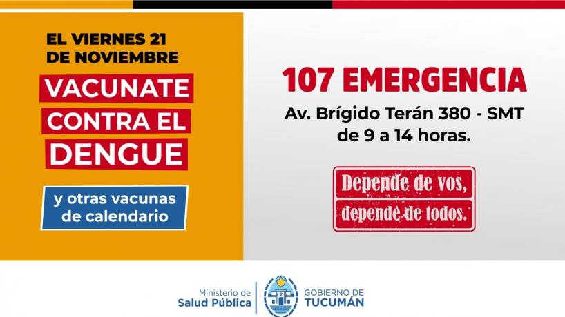 El ministro de Salud Pública, doctor Luis Medina Ruiz, confirmó que este viernes 21 de noviembre, el vacunatorio de la Dirección de Emergencias 107 abrirá sus puertas para una jornada especial de vacunación contra el dengue y otras vacunas de calendario de 9:00 a 14:00 horas, ofreciendo de esta manera la posibilidad a aquellos que no pueden concurrir durante la semana, de completar sus esquemas de inmunización.