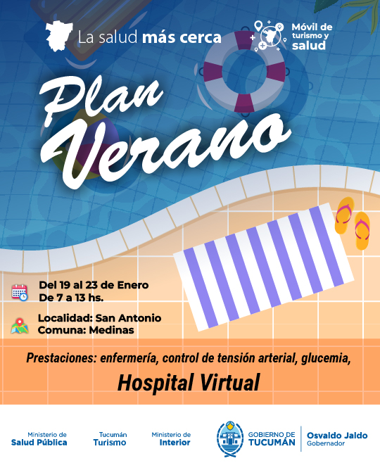 Por intermedio del Plan Verano el Ministerio de Salud Pública, a cargo del doctor Luis Medina Ruiz, lleva a zonas turísticas del interior de la provincia el tráiler que ofrece prestaciones de enfermería, controles de presión arterial, glucemia, entre otros servicios.