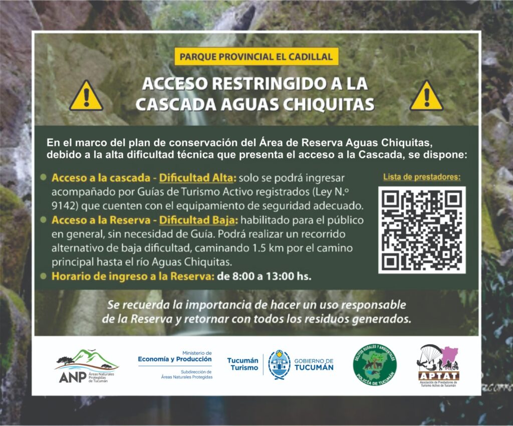 •    El acceso a la Cascada Aguas Chiquitas, de dificultad alta, se encuentra restringido para el público en general. Solo está permitido para visitantes que ingresen acompañados por Prestadores y/o Guías de Turismo Activo registrados, conforme a lo establecido en la Ley N° 9142, y que cuenten con el equipamiento de seguridad correspondiente.